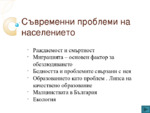 Раждаемост и смъртност. Миграцията – основен фактор за обезлюдяването. Бедността и проблемите свързани с нея. Образованието като проблем . Липса на качествено образование. Малцинствата в България. Екология...