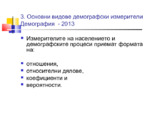 Основни видове демографски измерители. Измерителите на населението и демографските процеси приемат формата на: отношения, относителни дялове, коефициенти и вероятности...