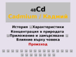 В материала са представени историята, произходът, геохимичните, кристалохимичните и химичните свойства на кадмия. Също така находищата, употребата му и опасностите свързани с него...