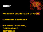 Хлорът е жълтозелен газ, с остра задушлива миризма, по-тежък от въздуха, не провежда електрически ток, разтваря се във вода (хлорна вода)...