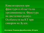 Кинезитерапия при фрактури в областта на предмишницата. Фрактури в областта на дисталния радиус. Имобилизационен, ранен следимобилизационен и кусен следимобилизационен период. Синдром на Зудек особености на кинезитерапията...