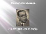 Биография и творчество на Светослав Минков. Роден през 1902 г. в Радомир и отраства в семейството на подполковник Константин Минков (1863 – 1918) и съпругата му Иванка Бенчева (29.9.1868 – 5.4.1953)...