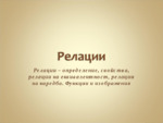 Релации, свойства на релациите, релации на еквивалентност, релации на наредба, функции на изображения, видове изображения, тъждествени и обратни изображения...