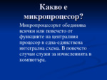 Микропроцесор - устройство, което обработва данни в съответствие с инструкции, записани в запомняща схема (памет)...