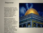 Йерусалим е свещената земя на всички вярващи – християни, юдеи и мюсюлмани. Йерусалим е "небесният град”, в който човек е най-близо до Бог, а душата му намира покой и опрощение...
