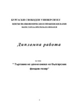 Настоящата дипломна работа има за цел да направи кратък обзор на търговията на ценни книжа, търгувани на Българския фондов пазар, като се акцентира главно върху търговията с ценни книжа ...