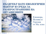 Въздухът като екологичен фактор и среда за разпространение на организмите. Свойства и особености на въздуха - ниска плътност, малко количество на водни пари, високо съдържание на кислород...
