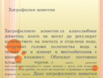 Днес хигрофилните животни са известни с три подкласа Anura (жаби), Caudata (саламандри и тритони) и Gymnophiona (безкраки змиеподобни земноводни разпространени в тропическите райони)...