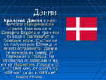 Презентацията съдържа снимки, текст, информация за държавата, население на Дания, площ на Дания, география на Дания, карта на Дания, климат на Дания, стопанство...