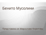 Бенито Амилкаре Андреа Мусолини е италиански политик и журналист, лидер на националната фашистка партия . Той управлява Кралство Италия като министър-председател от 1922 до 1925 г....