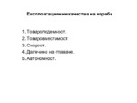 Експлоатационни качества на кораба:Товароподемност. Товаровместимост. Скорост. Далечина на плаване. Автономност...