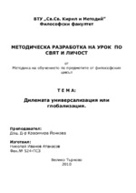 Записва заглавието на дъската дилемата универсализация или глобализация. Дава кратко представяне на новия урок, като споменава за какво става дума в неговото съдържание. Записва първа главна точка от новият урок...