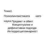 Предмет и обект. Концептуални и дефинитивни подходи. Интердисциплинарност на психолингвистиката. Психолингвистиката е гранична, междинна научна дисциплина, възникнала на границата между лингвистиката и психологията, която съчетава в себе си системата...