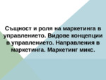 Същност и роля на маркетинга в управлението. Видове концепции в управлението. Направления в маркетинга. Маркетинг микс...