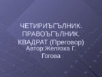 Презентацията запознава учениците с четириъгълник и квадрат. Формулите за обиколка на равнина...