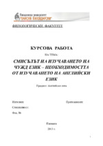 Курсова работа "Смисълът на изучаване на чужд език - необходимостта от изучаването на английски език е със следната структура: увод, три глави, заключение, библиография и приложение. Ползва се във Филологически факултет...