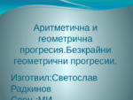 Презентацията съдържа съвкупност от теоретична и практическа част върху безкрайните геометрични прогресии...