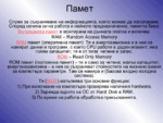 Паметта служи за съхраняване на информацията, която можем да използваме. Според начина си на работа и нейното предназначение, паметта бива...