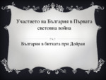 България в битката при Дойран. Първата световна война е военен конфликт, продължил от 1914 до 1918 година. В него се включват повечето Велики сили, обединени в две противостоящи коалиции – Антантата и Централните сили...
