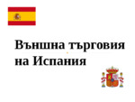 Презентацията включва външна търговия и взаимоотношения с търговски партньори на Испания. Графики за внос, износ, БВП. Членство на страната в световни организации и др....