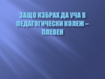 В презентацията се описва моето лично мнение защо избрах да уча в Педагогически колеж - Плевен....