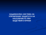 Националната система за защита при бедствия и кризи. Мисия на системата - осъществява дейности по превенция и защита на населението от бедствия и кризи...