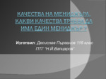 Качествата, които трябва да притежава мениджъра, са изключително разнообразни. Те обаче могат да бъдат обобщени и разделени в две групи: Вродени качества...
