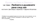 Презентацията включва философска гледна точка относно душевните рани, а също и пояснение на думата “любов”, научна гледна точка, любовта във философията...