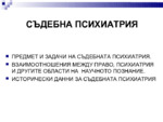 Съдебната психиатрия е клон на психиатрията, в който се разглеждат сложните проблеми, възникващи при срещата между психиатрията и правото...
