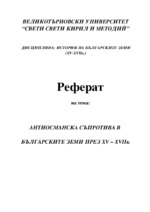 В реферата с разгледани особеностите и етапите на антиосманската съпротива в българските земи през периода XV – XVIIв. Поява на хайдутството в България. Първо Търновско въстание. Второ Търновско въстание, Чипровско въстание и Карпошово въстание...