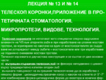 Телескоп коронките се използват като специални опорно-задръжени елементи на чп към опорните зъби и при изработване на сложни мостови протези, за коригиране на наклона на един от мостоносителите за създаване на успоредност...